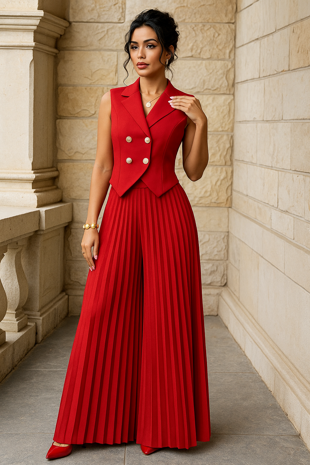 Redécouvrez la classe moderne avec notre Ensemble Élégance d’Été, gilet sans manches à revers croisés et pantalon plissé fluide. Parfait pour un style raffiné qui reste confortable du matin jusqu’au soir.